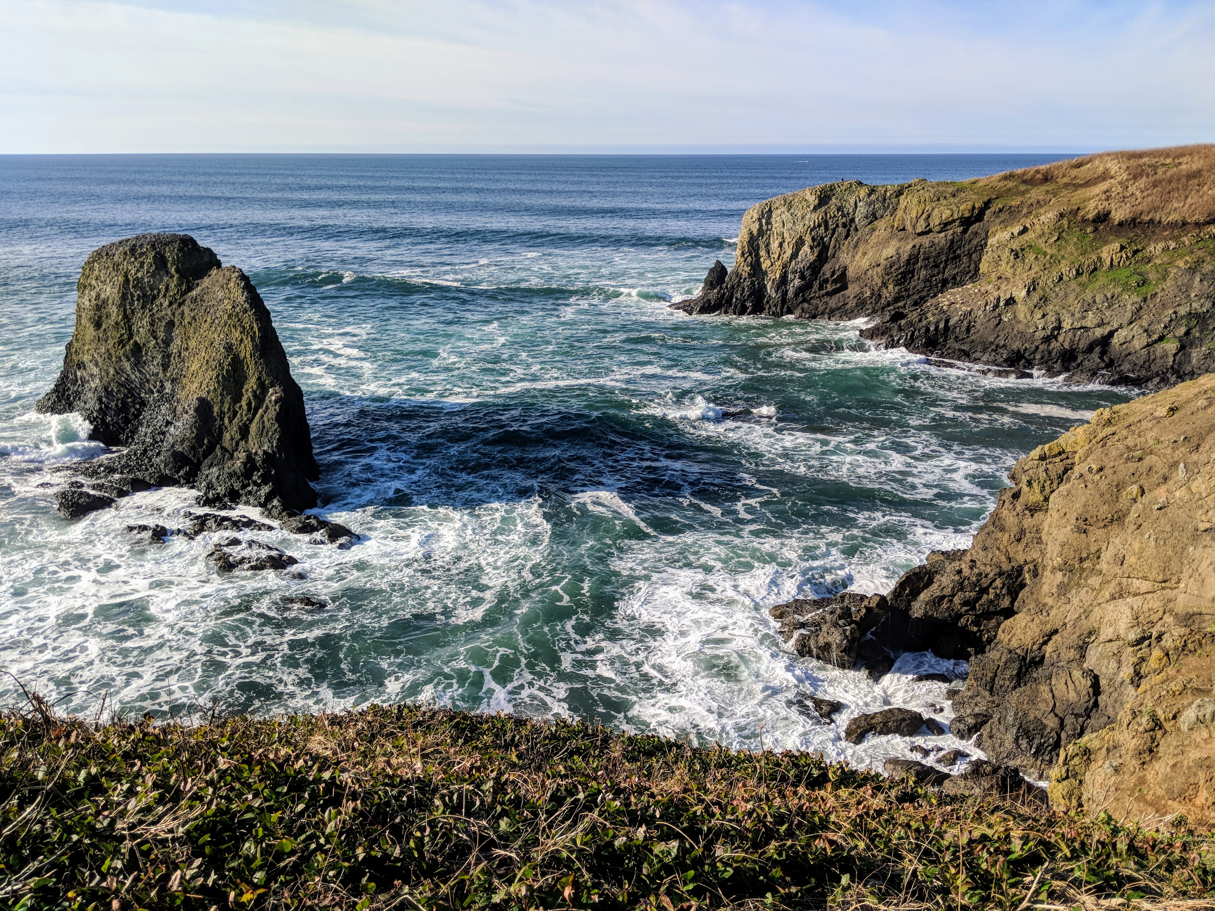 On our way south to Yachats, we had a few scenic stops. The first was Devil’s Punchbowl State Natural Area (Otter Rock, OR 97369), which is located about 8 miles (13 km) north of Newport. This natural area is known for its eroded yellow sandstone bowl, formed by the convergence and collapse of two caves. Waves enter the bowl and often violently churn, swirl, and foam.